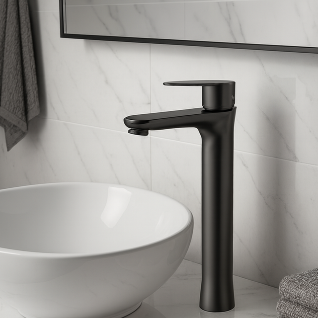 Grifería Monocontrol Alta POSTO en acabado gris concreto, diseñada para lavamanos tipo bowl o sobreponer. Su estilo moderno y textura mate aportan elegancia y personalidad a cualquier baño, manteniendo durabilidad y funcionamiento preciso.