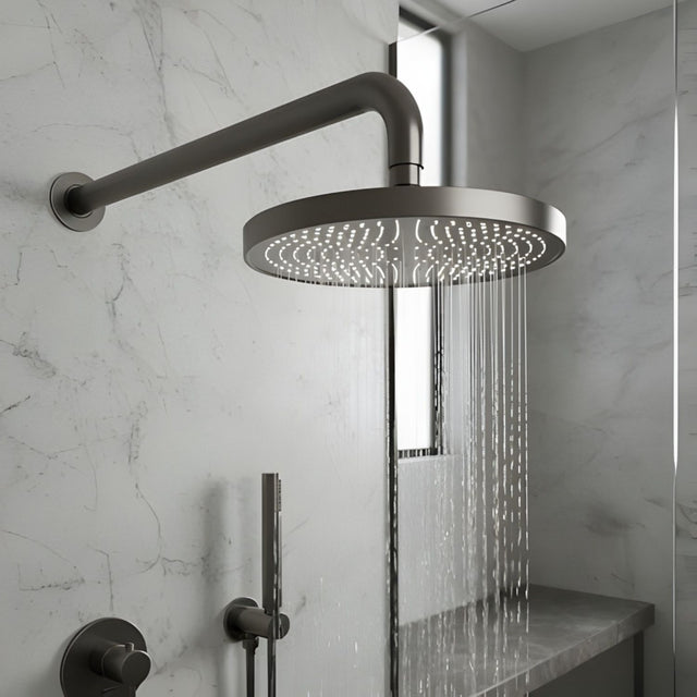 La regadera redonda de 10” SPACCO en acabado gris concreto ofrece un diseño moderno y acabado texturizado de alta calidad. Su cuerpo está fabricado con materiales duraderos y resistentes a la corrosión, garantizando una experiencia de baño uniforme, eficiente y de larga vida útil.