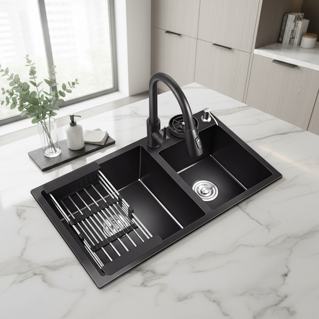 Lavaplatos Doble Acero Inox Negro 81 cm x 43 cm — diseño premium, paquete completo y acabado negro mate.