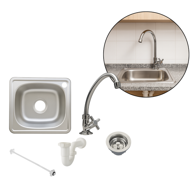 Set de lavaplatos en acero inoxidable de alta resistencia, ideal para cocinas modernas que buscan funcionalidad y durabilidad. Su diseño compacto de 36x39 cm lo hace perfecto para espacios reducidos, manteniendo la practicidad y el estilo. Incluye grifería sencilla tipo ganso y accesorios básicos para una instalación rápida.